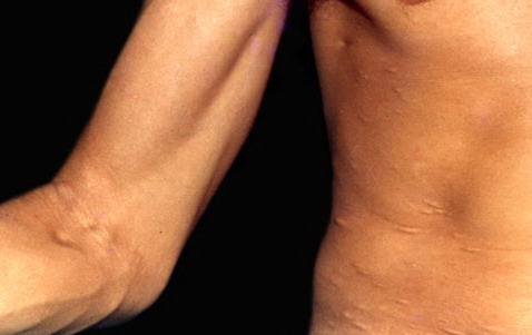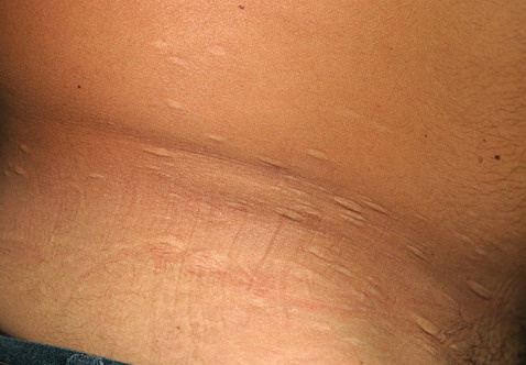 Glucocorticoid-induced atrophy occurs most commonly over the triceps or buttocks at sites where injections are usually given. Clinically, the lesions resemble atrophoderma. History is obviously most helpful in making the diagnosis. Polarization may show the steroid crystals in the dermis.