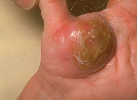 A calcifying, recurrent but infiltrating nonmetastasizing fibromatosis appearing as small nodules that are unattached to the overlying skin and seen most frequently on the palms of children.