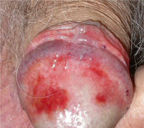 An asymptomatic presentation with little or no dyspareunia is classic. Conversely, the signs can be florid. Well-demarcated, glistening, moist, shiny, bright red or autumn brown patches symmetrically involve the glans and inner prepuce, sparing the keratinized penile shaft or foreskin . Other signs include dark red stippling or “cayenne pepper spots” due to hemosiderin deposition and solitary or multiple lesions of differing sizes (guttate or nummular), characteristically “kissing.” Rarely, erosive and vegetative presentations have been reported, but lesions with asymmetric, atypical, or unusual morphology should be viewed with great suspicion and the organ inspected diligently for other, less florid signs. ZB may be secondary and may thus conceal more subtle evidence of underlying preputial disease such as LSc, pre-cancer, or frank cancer that might have induced the manifest zoonoid changes. Overt cases of other dermatoses such as contact dermatitis, psoriasis, LSc, LP, penis pre-cancer, and penile cancer may appear to have zoonoid changes on clinical and histologic examination . It is possible that some of the clinical and histologic variants that have been reported and the dubious claim that ZB per se is a pre-malignant condition are a consequence of this phenomenon.