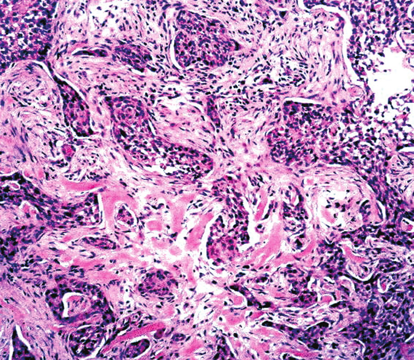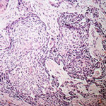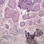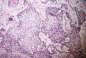 Metastasis of BCC occurs only rarely, with rates varying from 0.0028 percent to 0.55 percent.34-36 Involvement of lymph nodes and lungs is most common. Von Domarus et al. reported five cases of metastatic BCC in which perineural or intravascular invasion had been noted in three.37 Squamous differentiation was not observed in the primary tumors in the cases they presented but was noted in two of five cases of metastatic cancer. Overall, squamous differentiation was present in 15 percent of the primary or metastatic tumors from the 170 cases reviewed. Aggressive histologic characteristics, including morpheaform features, squamous metaplasia, and perineural invasion, have been identified as risk factors for metastasis.