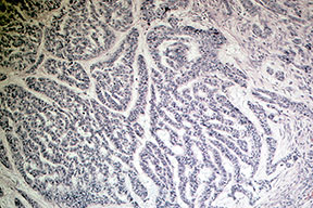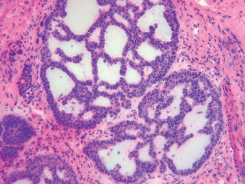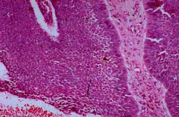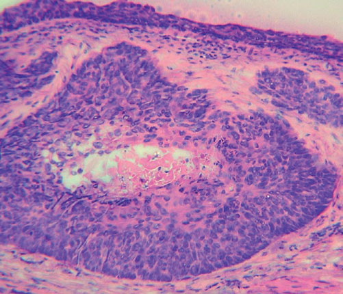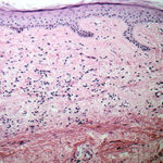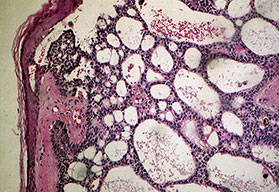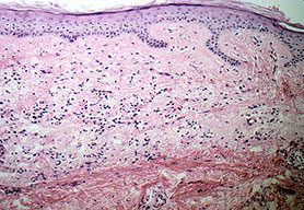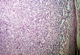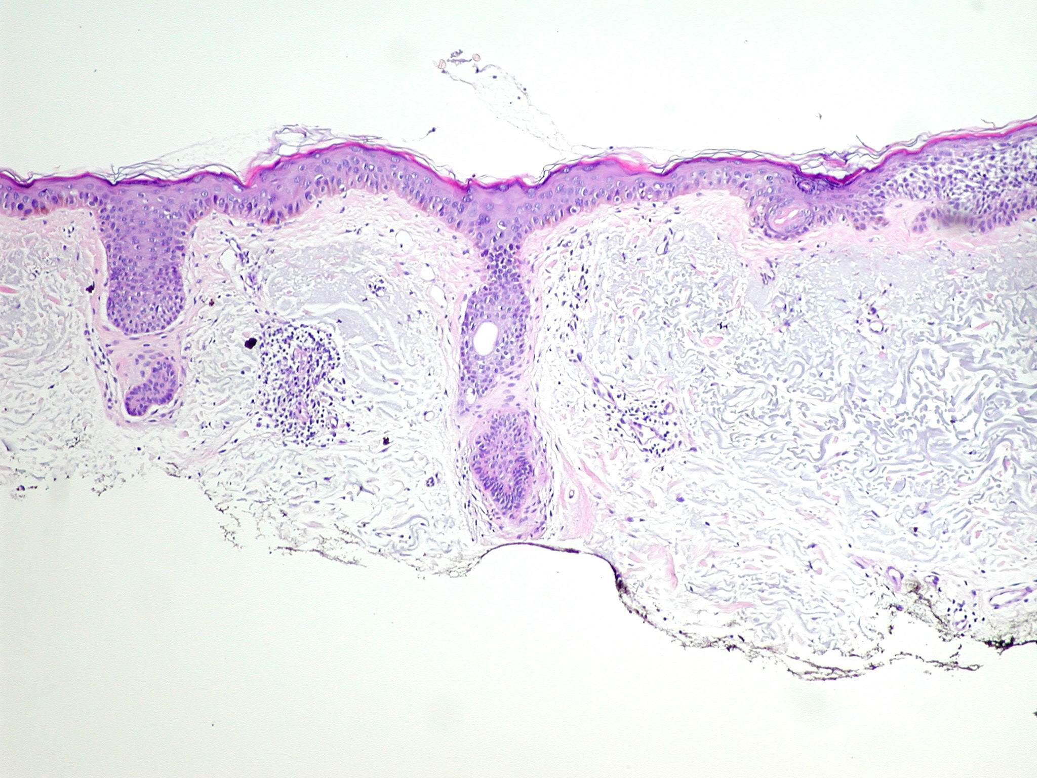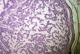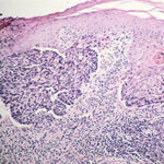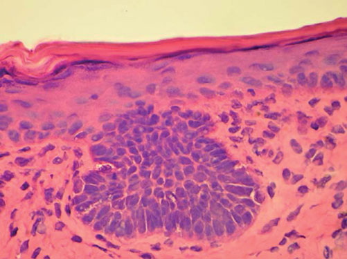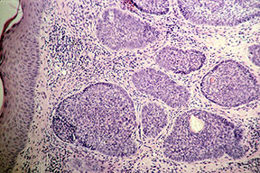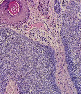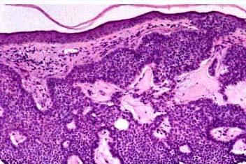 Superficial BCC is characterized microscopically by buds of malignant cells extending into the dermis from the basal layer of the epidermis. The peripheral cell layer shows palisading. There may be epidermal atrophy, and dermal invasion is usually minimal. This histologic sub-type is encountered most often on the trunk and extremities but may also appear on the head and neck. There may be a chronic inflammatory infiltrate in the upper dermis.