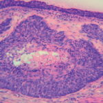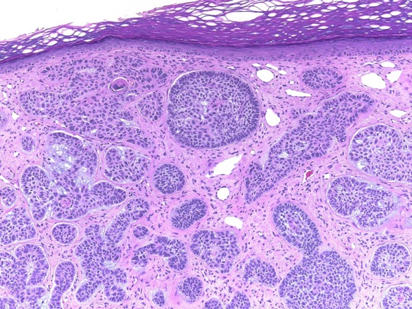 Basal cell carcinoma (BCC) is a malignant neoplasm derived from nonkeratinizing cells that originate in the basal layer of the epidermis. If left untreated, BCC will continue to invade locally and may result in substantial tissue damage that compromises function and cosmesis. Metastasis is an extremely rare event.