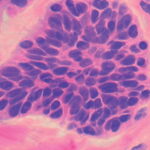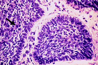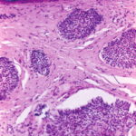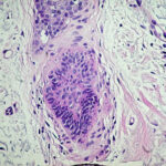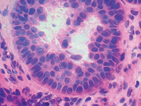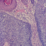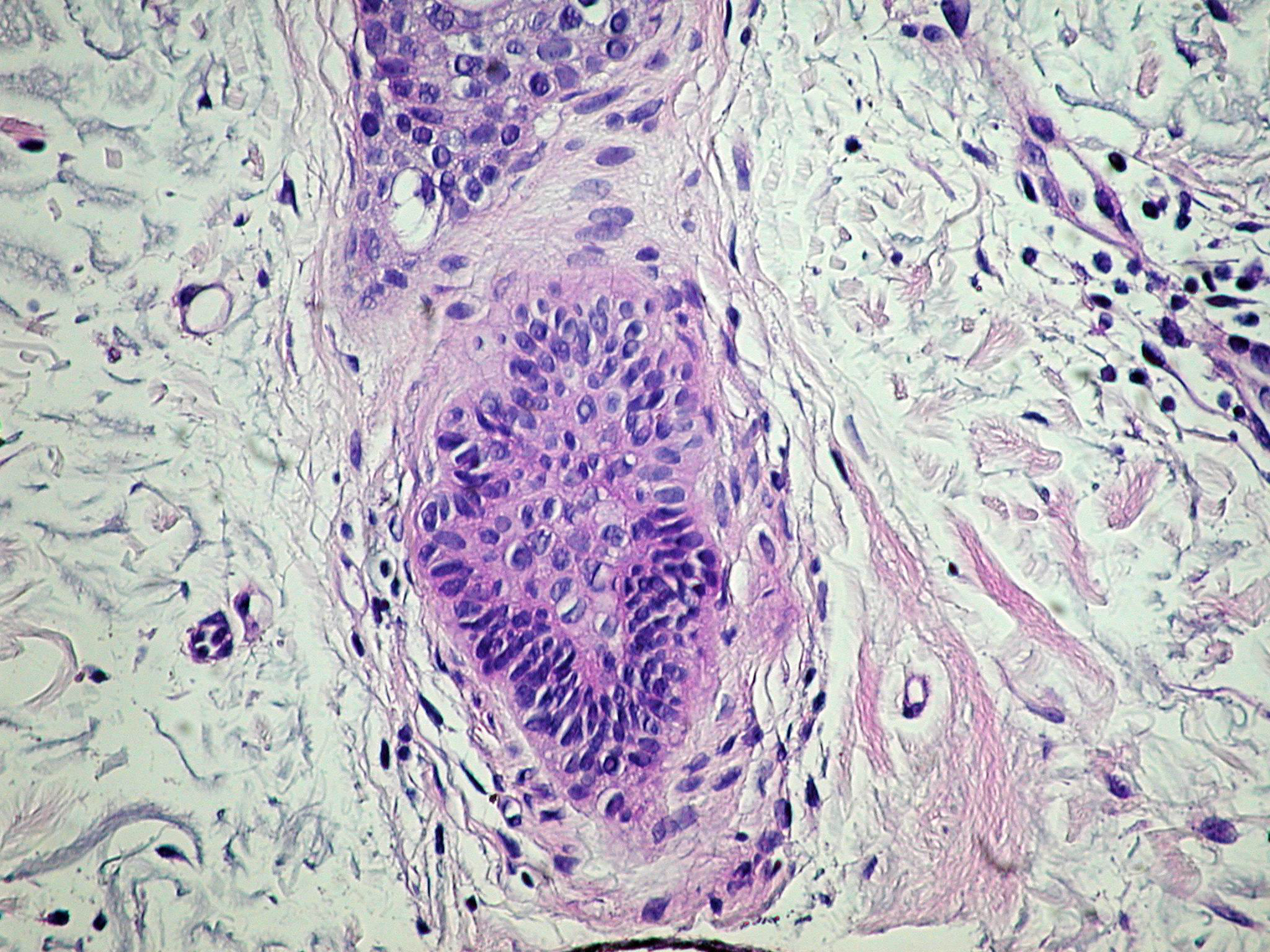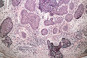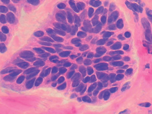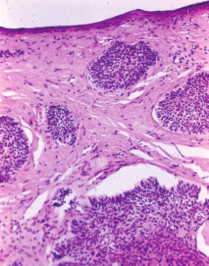 The malignant basal cells have large nuclei and relatively little cytoplasm. Although the nuclei are large, they may not appear atypical. Usually, mitotic figures are absent. Frequently, retraction of stroma from tumor islands is present, creating peritumoral lacunae that are helpful in histopathologic diagnosis.