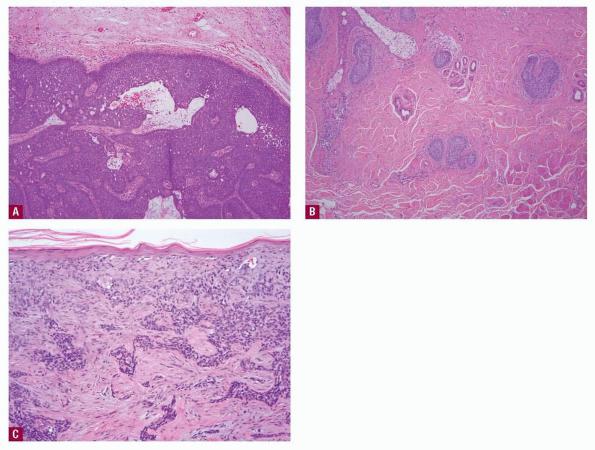 Histopathologic features vary somewhat with sub-type, but most BCCs share some common histologic characteristics.