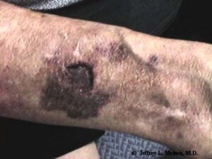 Chronic sun exposure leads to skin changes that predispose patients to actinic purpura. Because of the ultraviolet-induced atrophy, the connective tissue of the dermis is no longer able to adequately support the microvasculature. As a result, even minor trauma can tear the blood vessels, leading to the extravasation of blood.