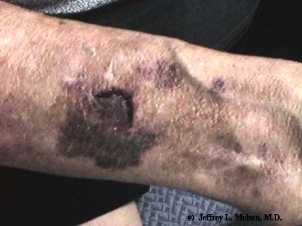 Purpuric patches and macules larger than 3 mm in diameter are usually present on the extensor surfaces of the forearms and on the dorsa of the hands; the lesions do not extend onto the fingers. Ecchymoses may also be found on the neck and face. Macules and patches are dark purple and irregularly shaped. A sharp margin is seen between the borders of the lesions and the surrounding skin.