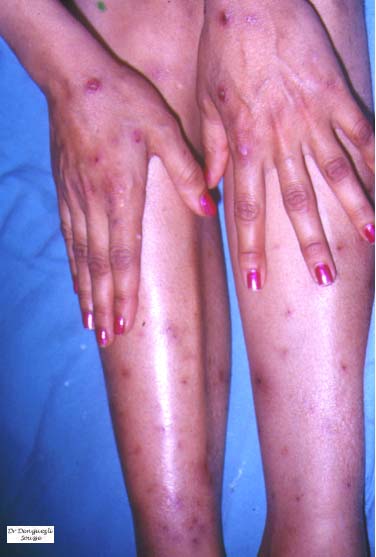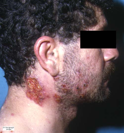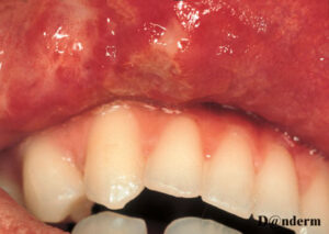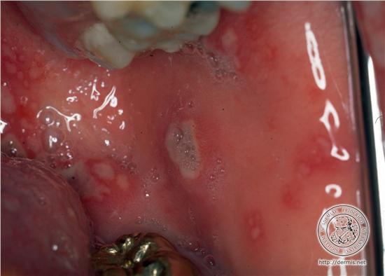 Extracutaneous lesions histologically mirror the skin changes. Oral aphthous ulcers demonstrate a central diffuse