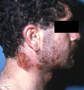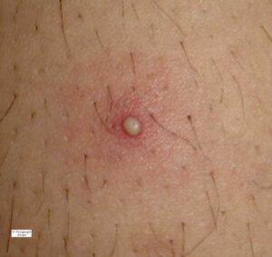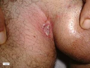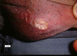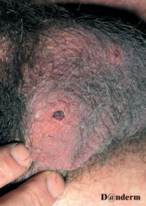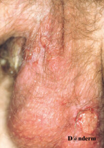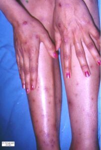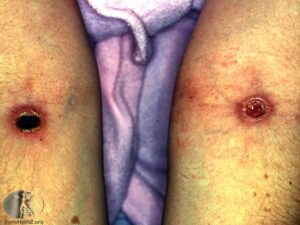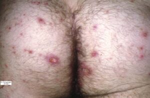 The cutaneous lesions include erythema nodosum-like nodules, vesicles, pustules, pyoderma gangrenosum, Sweet’s syndrome, a pustular reaction to needle trauma, superficial migratory thrombophlebitis, ulceration, infiltrative erythema, acral purpuric papulonodular lesions, and acneiform folliculitis .