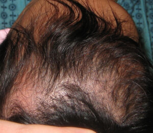 Infection with T tonsurans often begins in the perifollicular stratum corneum. After a period of incubation, hyphae spread into and around the hair shafts. Arthroconidia in the shafts cause the hairs to become brittle. The hairs break at the surface of the scalp, where they lose the support of the follicular wall (4). The broken hairs that remain below the surface of the scalp give the appearance of black dots in the area of hair loss. (Of course, “blond-dot” tinea capitis occurs in persons with blond hair.)
