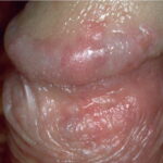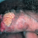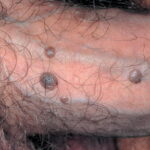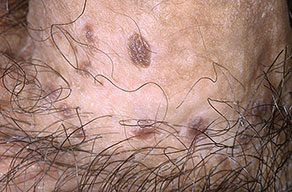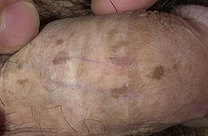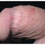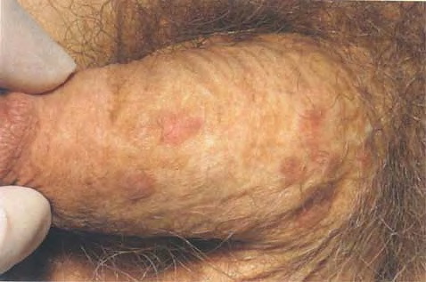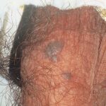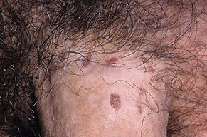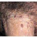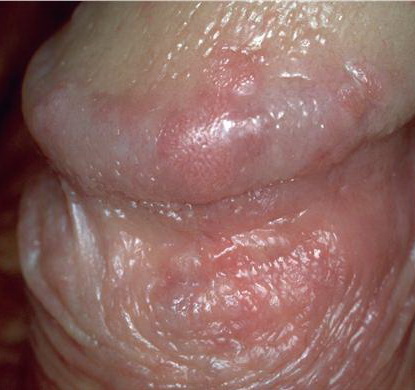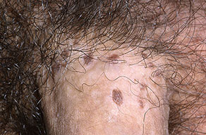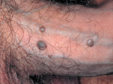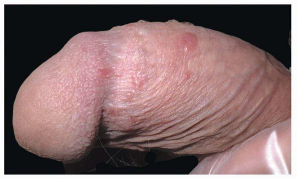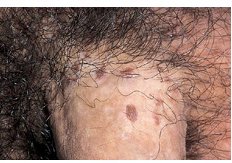 BP is caused by infection with HPV, and numerous HPV types have been linked to BP, including types 42, 48, and 51 to 54 . Lesions are pink, reddish brown, or violaceous Differential diagnosis includes early condylomata acuminata