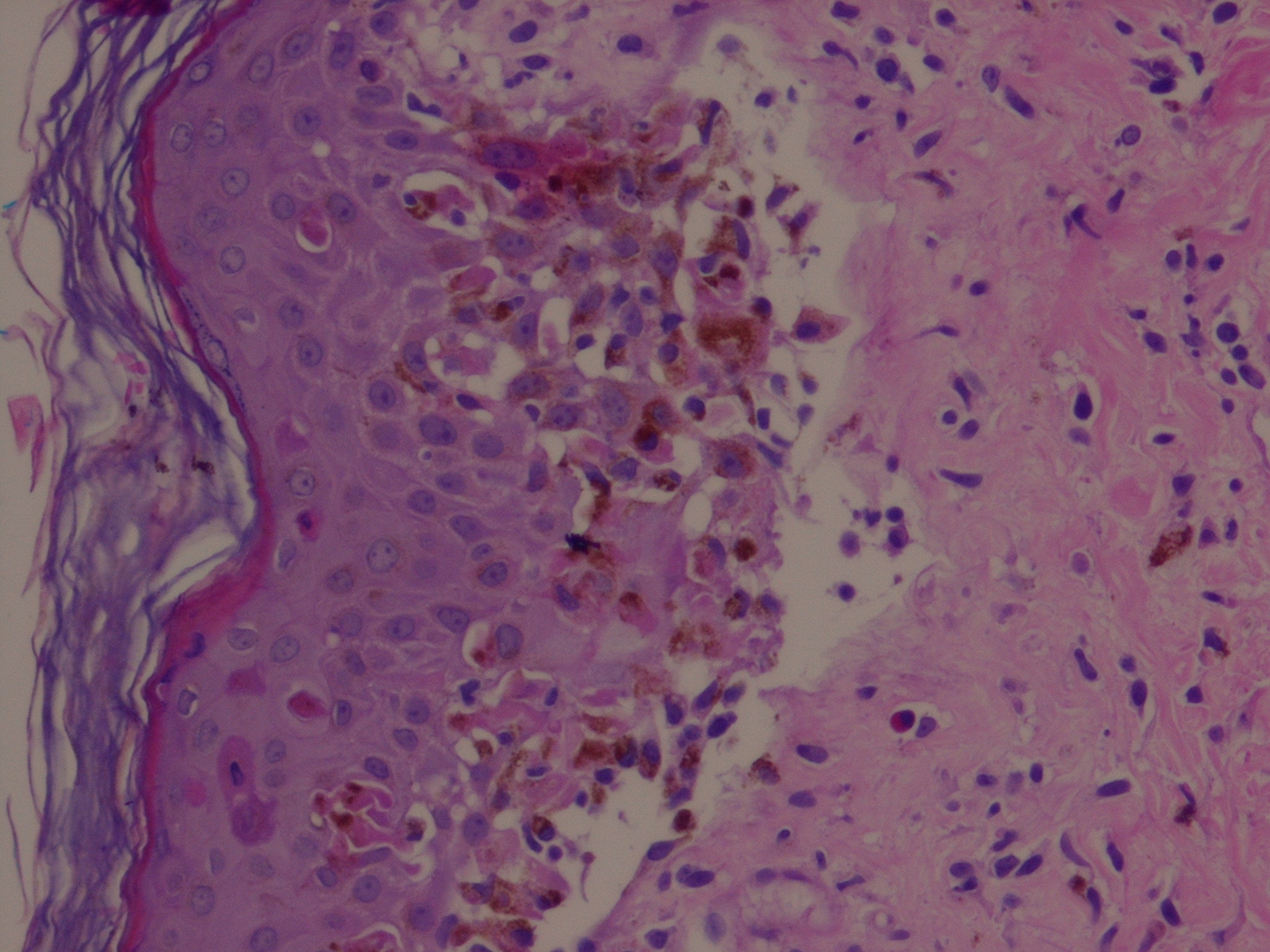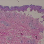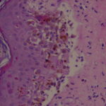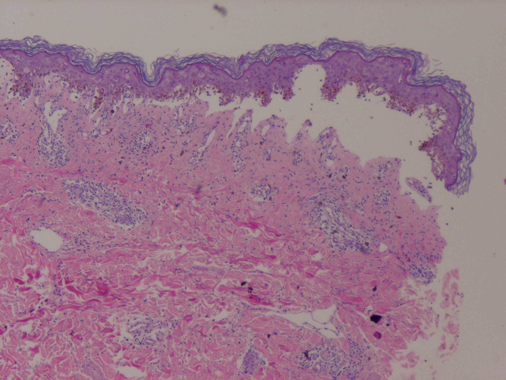 Early lesions of EM exhibit lymphocyte accumulation at the dermal-epidermal interface, with exocytosis into the epidermis, lymphocytes attached to scattered necrotic keratinocytes (satellite cell necrosis), spongiosis, vacuolar degeneration of the basal cell layer, and focal junctional and sub-epidermal cleft formation . The papillary dermis may be edematous but principally contains a dense mononuclear cell infiltrate, which is more abundant in older lesions. The vessels are ectatic with swollen endothelial cells; there may be extravasated erythrocytes and eosinophils. Immunofluorescence findings are negative or non-specific. In advanced lesions sub-epidermal blister formation may occur, but necrosis rarely involves the entire epidermis . In late lesions, melanophages may be prominent.