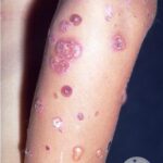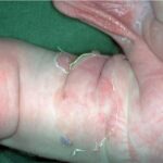 Three types of skin eruptions can be produced by phage group II S. aureus, particularly strains 77 and 55: (1) bullous impetigo, (2) exfoliative disease (SSSS), and (3) nonstreptococcal scarlatiniform eruption (staphylococcal scarlet fever). All three represent varying cutaneous responses to extracellular exfoliative toxins (“exfoliatin”) types A and B produced by these staphylococci . Exfoliative toxin A acts as a serine protease of desmoglein 1, the desmosomal cadherin that is also the target of autoantibodies in pemphigus foliaceus.