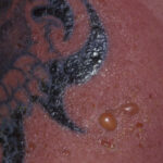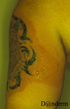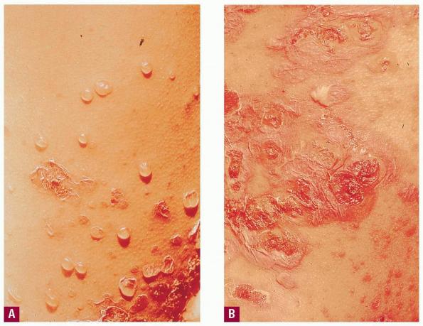 Bullae usually arise on areas of grossly normal skin. The Nikolsky sign (sheet-like removal of epidermis by shearing pressure) is not present. Bullae initially contain clear yellow fluid that subsequently becomes dark yellow and turbid , and their margins are sharply demarcated without an erythematous halo. The bullae are superficial, and within a day or two, they rupture and collapse, at times forming thin, light-brown to golden-yellow crusts . So-called bullous varicella represents superinfection by S. aureus (phage group II) of varicella lesions (bullous impetiginization).