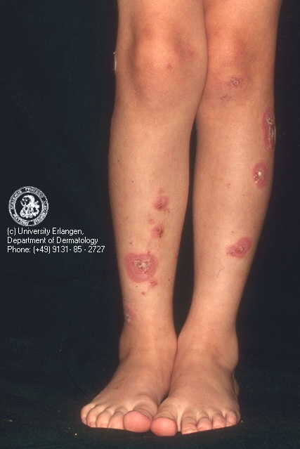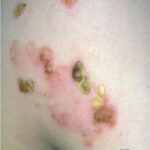 Staphylococcal impetigo responds quite promptly to appropriate treatment. In an adult with extensive or bullous lesions, dicloxacillin (or similar penicillinase-resistant semi-synthetic penicillin), 250 to 500 mg orally (PO) four times daily (qid), or erythromycin (in the penicillin-allergic patient), 250 to 500 mg PO qid, should be given. Treatment should be continued for 5 to 7 days (10 days if streptococci are isolated). Also, a single course of oral azithromycin (in adults 500 mg on the first day, 250 mg daily on the next 4 days) has been shown to be equally as effective as dicloxacillin for skin infections in adults and children. For impetigo caused by erythromycin-resistant S. aureus, which is commonly isolated from impetigo lesions of children, amoxicillin plus clavulanic acid [25 mg/kg/day given three times a day (tid)],
