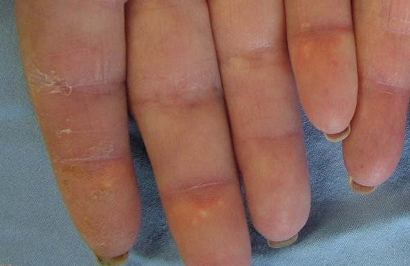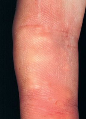 Dystrophic calcification frequently occurs in connective tissue diseases. Scleroderma and CREST syndrome (calcinosis cutis, Raynaud phenomenon, esophageal dysfunction, sclerodactyly, telangiectasia) are notable examples that are frequently associated with calcinosis cutis . In these disorders, nodules and plaques of calcium deposits may occur in the skin, subcutaneous tissue, muscle, or tendons. The calcium deposits most commonly occur on the upper extremities, especially on the fingers and wrists, but may occur in any area subject to trauma or motion. As the calcifications enlarge, they may ulcerate and exude a chalky material.