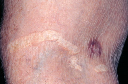 Dystrophic calcification also occurs in dermatomyositis . It is more commonly associated with juvenile rather than adult-onset dermatomyositis, occurring in 44 percent to 70 percent of children as opposed to 20 percent of adults. The calcification tends to occur 2 to 3 years after disease onset and most frequently appears on the elbows, knees, shoulders, and buttocks.18 The calcium deposits may be painful and can ulcerate. They also may exude a chalky material, form sinuses, and become chronically infected. Calcium salt deposition may become quite extensive, progressing along fascial planes of skin and muscle, forming an “exoskeleton,” and leading to significant morbidity and mortality. Calcinosis cutis in dermatomyositis is difficult to treat; however, if the patient survives long enough, the calcified nodules may improve spontaneously.