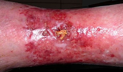 Dystrophic calcification has been observed in patients with porphyria cutanea tarda Sclerodermoid plaques with dystrophic calcification have occurred on the preauricular area, scalp, neck, and dorsa of the hands. Ulceration with trans-epidermal elimination of sheets of calcium is also rarely reported.