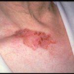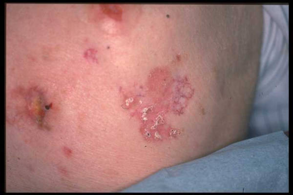 • Topical 5-fluorouracil 5% (Efudex): 5-Fluorouracil (5-FU) applied twice daily for 2-12 weeks can be effective in treating superficial basal cell carcinoma, with a reported cure rate as high as 93%.30 The use of 5-fluorouracil for other types of basal cell carcinoma is generally not recommended because it may not penetrate deeply enough into the dermis to eradicate all tumor cells. Irritation and crusting are common and expected; significant irritation and discomfort are not uncommon, but scars are unusual. The recurrence rate is very high.