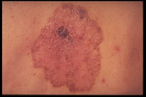 • The tumor appears multicentric, with areas of clinically normal skin intervening among clinically involved areas.