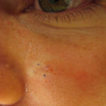 • Surgical excision: After adequate anesthesia is administered to the patient, a No. 15-blade or 10-blade scalpel is used to incise down to the subcutis. To increase the likelihood of complete tumor removal, one must include a margin of normal-appearing skin in order to remove all clinically invisible tumor extension. The larger the amount of clinically normal-appearing skin removed, the higher the cure rate, although the more extensive removal leaves a larger surgical defect and a poorer cosmetic result in most patients. In most circumstances, a 3- to 4-mm margin of normal, clinically uninvolved skin is removed.44 This procedure is normally performed during a skin biopsy procedure.45