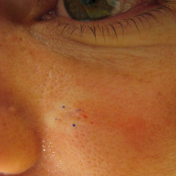 • Disadvantages: This procedure is not widely accepted and not commonly performed. The procedure is operator-dependent and often leaves a white atrophic scar. It is less effective on the nose, and the tumor often tracks down pilosebaceous units. This procedure is less effective in treating infiltrating basal cell carcinoma, micronodular basal cell carcinoma, morpheaform (sclerosing) basal cell carcinoma, and recurrent basal cell carcinoma than is Mohs micrographic surgery, which is considered the treatment of choice in most instances.