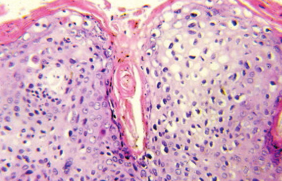 Read MoreBowen’s disease = داء بوفن OLYMPUS DIGITAL CAMERA OLYMPUS DIGITAL CAMERA OLYMPUS DIGITAL CAMERA Bowen disease Bowen disease is a full-thickness anaplasia of the epidermis, with loss of the normal maturation of its components. Keratinocytes are atypical and disorderly, often described as having a windblown appearance. Although the basal cell layer is intact, extension of […]