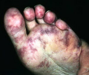 Despite these advances, cholesterol embolism is still a troublesome entity to clinically diagnose and effectively treat. Fine’s description of livedo reticularis or blue toes (as shown below) in the presence of good peripheral pulses remains invaluable in recognizing cholesterol embolism. However, a high index of suspicion is imperative because symptoms of cholesterol embolism are often atypical, unrecognized, not temporally correlated with the onset of physical findings, or not reported by the patient. Additionally, laboratory test results are not specific for cholesterol embolism. More importantly, although biopsy results demonstrating the needle-shaped cholesterol clefts and intravascular microthrombi are the most specific findings, histologic diagnosis does not always correlate with clinical disease.