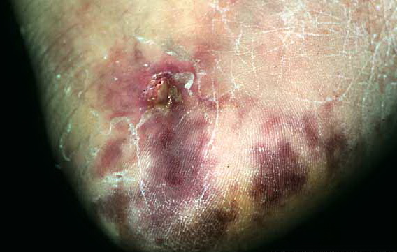 Acrocyanosis or blue toe syndrome: Occurring in 28% of patients, this is a characteristic blue-black or violaceous discoloration of the distal extremities. The lesions are painful, discolored, or even necrotic from ischemia. Blue toe syndrome, a term coined by Karmody et al,11 refers to acute digital ischemia caused by microembolism from the distal aorta, iliac artery, or femoral artery