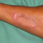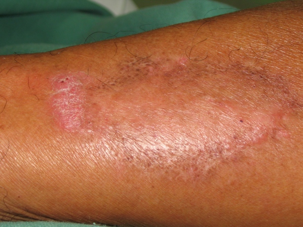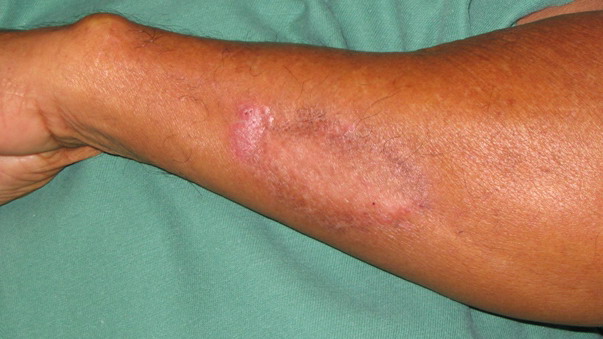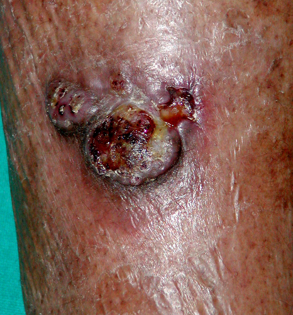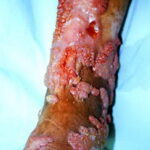 The initial site of the infection is usually on the feet, legs, arms, or upper trunk. The clinical features vary. The initial lesion is often a warty papule that expands slowly over months or years . Alternatively, lesions may be plaque-like with an atrophic center. The more common verrucous form spreads slowly and locally. Individual lesions may be very thick and often develop secondary bacterial infection. Satellite lesions around the initial site of infection are local extensions of the infection and usually are produced by scratching. Complications of chromoblastomycosis include local lymphedema, leading to elephantiasis and squamous carcinomas in some chronic lesions.