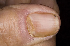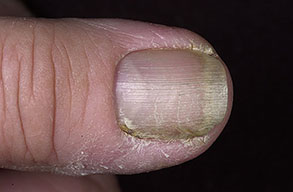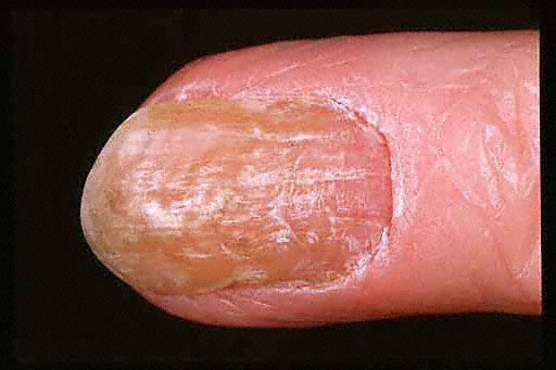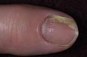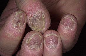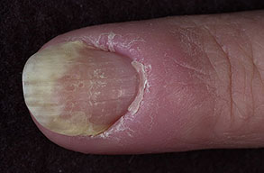 Other conditions associated with abnormalities of the nail fold that predispose individuals to chronic paronychia include psoriasis, mucocutaneous candidiasis, and drug toxicity from medications such as retinoids, epidermal growth factor receptor inhibitors (cetuximab), and protease inhibitors.1,2 Of particular interest is the antiretroviral drug indinavir, which induces retinoidlike effects and remains the most frequent cause of chronic paronychia in patients with HIV disease.