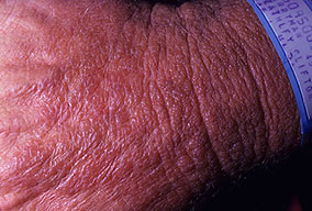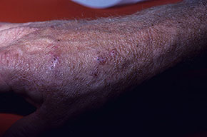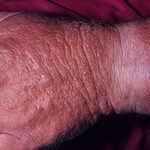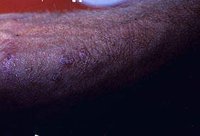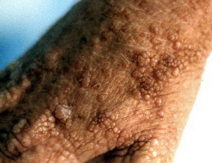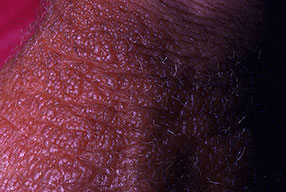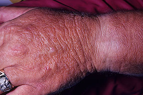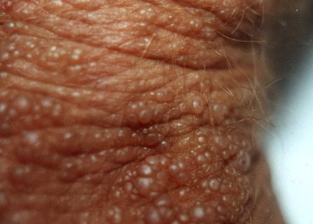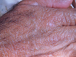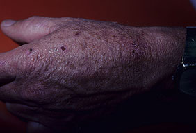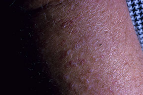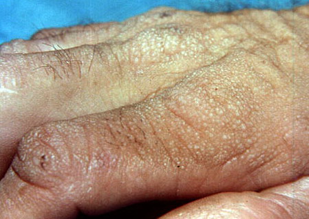 Papules develop gradually over the facial area and light-exposed sites. Patients with colloid milium are usually asymptomatic, but they may have transient itching in affected areas.