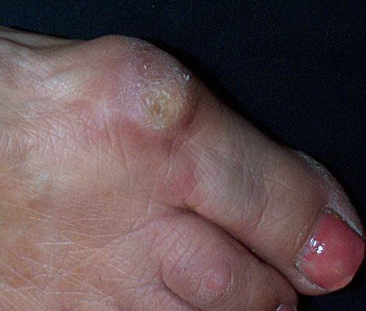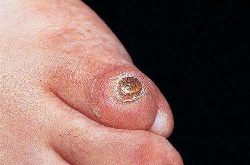 subhelomal bursitis and blistering that can rupture to the surface. Because of the close proximity of some corns to joints and bone, septic arthritis and/or osteomyelitis can ensue. The mechanical forces that cause corns and calluses can also rupture portions of the subcutaneous vascular plexus, which leads to hemorrhage into keratotic tissue. In healthy patients, such findings are of minor significance, but in other cases (e.g., in diabetic patients and patients with connective tissue disease), they may herald extensive skin ulceration or vasculitis.