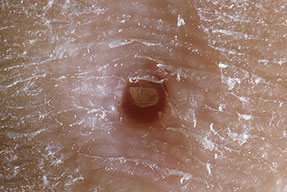 Another variant of corn is that referred to as heloma miliare, or seed corn. This title is derived from the clinical appearance of these corns: multiple guttate keratoses that are easily pared. When seamed nylon hosiery was fashionable, this garment was considered the causative factor. However, patients still present with seed corns even though they have never worn seamed stockings.