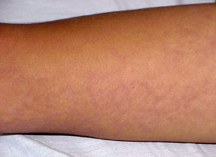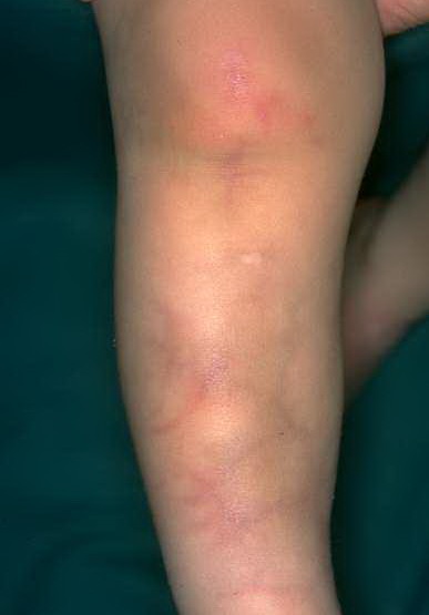 The primary lesion is characterized by pinkish blue, reticular, and patchy skin changes. Lesions may be localized or generalized. Localized lesions were observed in 60% of the patients in one series, but this percentage varies. Persistent cutis marmorata, telengiectasia, and phlebectasia may occasionally be associated with cutaneous atrophy and ulceration of the involved skin.6