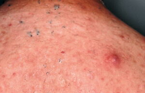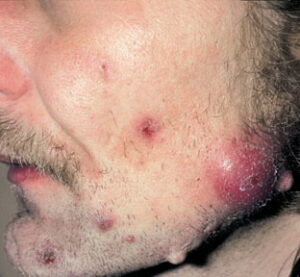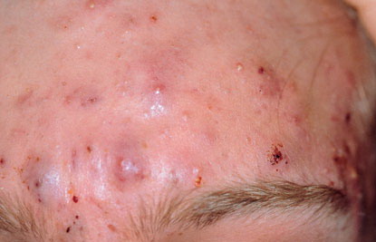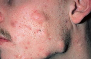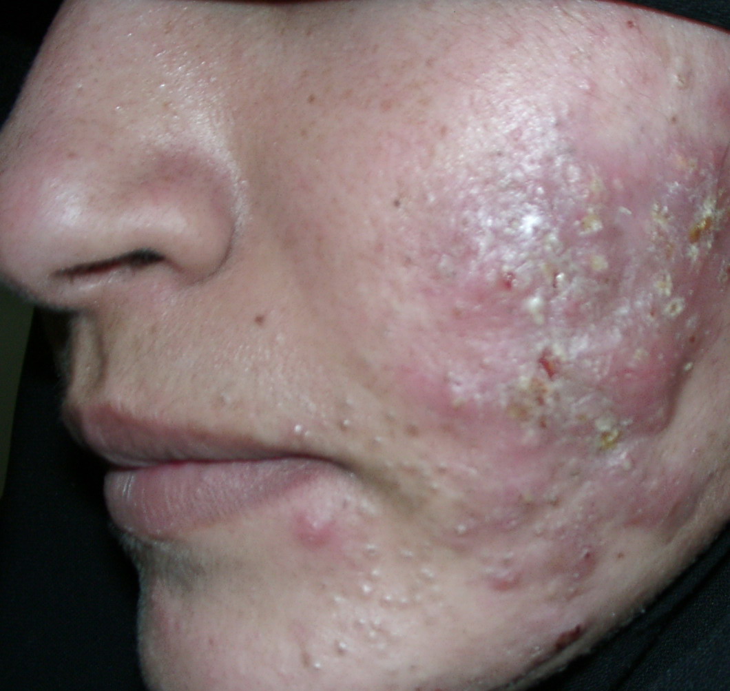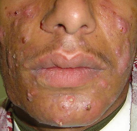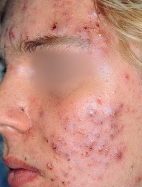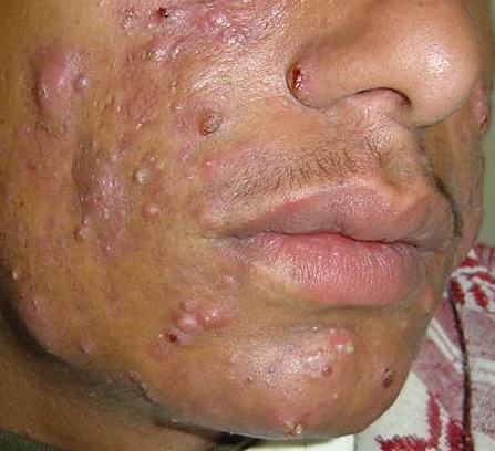 Acne Conglobata: This is the most severe form of acne vulgaris and is more common in males. It is characterized by numerous large lesions, which are sometimes interconnected, along with widespread blackheads. It can cause severe, irrevocable damage to the skin, and disfiguring scarring. It is found on the face, chest, back, buttocks, upper arms, and thighs. The age of onset for acne conglobata is usually between 18 to 30 years, and the condition can stay active for many years. As with all forms of acne, the cause of acne conglobata is unknown. Treatment usually includes isotretinoin (Accutane), and although acne conglobata is sometimes resistant to treatment, it can often be controlled through aggressive treatment over time.