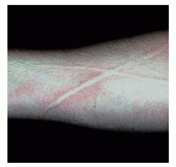 The term dermographism literally means writing on the skin. Firm stroking of the skin produces an initial red line (capillary dilatation), followed by an axon-reflex flare with broadening erythema (arteriolar dilatation) and the formation of a linear wheal (transudation of fluid/edema) termed the triple response of Lewis. An exaggerated response to this constitutional whealing tendency is seen in approximately 2-5% of the population and is termed dermographism. In a minority of people, it is accompanied by itching (symptomatic dermographism).