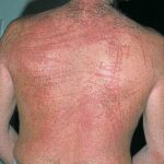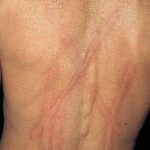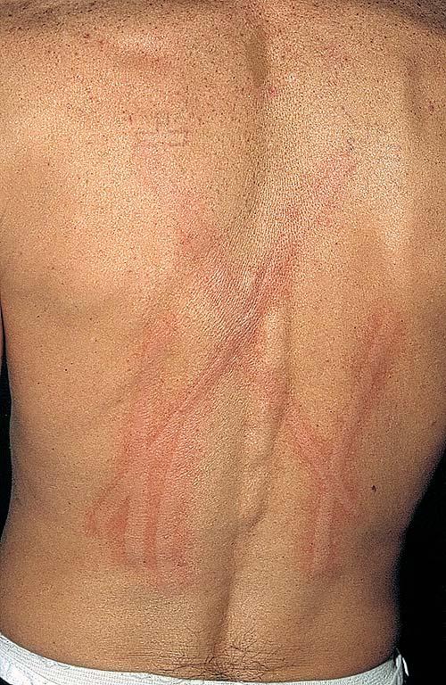 • Symptomatic dermographism may be triggered by drugs (eg, penicillin), an insect bite, Helicobacter pylori infection, or an infestation (eg, scabies, Fasciola hepatica).