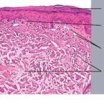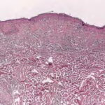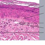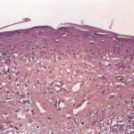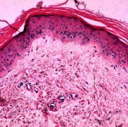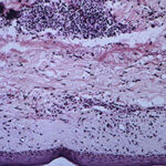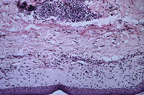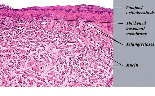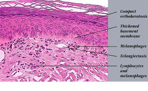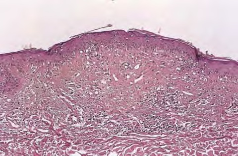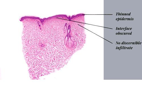 Histopathology. The erythematous-edematous lesions of the skin in dermatomyositis may show only nonspecific inflammation. However, quite frequently the histologic changes are indistinguishable from those seen in SLE. There is epidermal atrophy, basement membrane degeneration, vacuolar alteration of basilar keratinocytes, a sparse lymphocytic inflammatory infiltrate around blood vessels, and interstitial mucin deposition . With severe inflammatory changes, there may be associated subepidermal fibrin deposition. Although immune complexes are not detected at the dermal-epidermal junction as in lupus erythematosus, it should be |