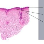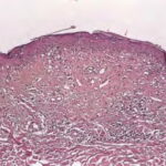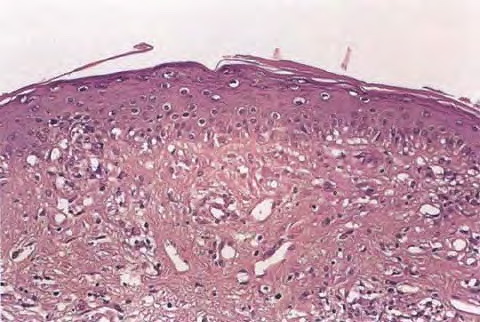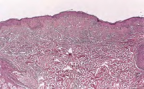 Old cutaneous lesions with the clinical appearance of poikiloderma atrophicans vasculare usually show a bandlike infiltrate under an atrophic epidermis with hydropic degeneration of the basal cell layer (see also the section on poikiloderma atrophicans vasculare). The Gottron’s papules overlying the knuckles also show vacuolization of the basal cell layer but acanthosis rather than epidermal atrophy . Subcutaneous tissue may show focal areas of panniculitis associated with mucoid degeneration of fat cells in early lesions. Extensive areas of calcification may be present in the subcutis at a later stage . |