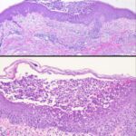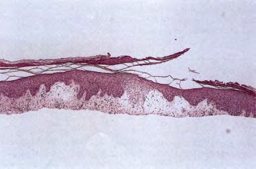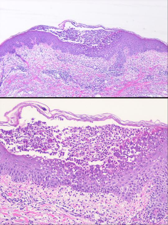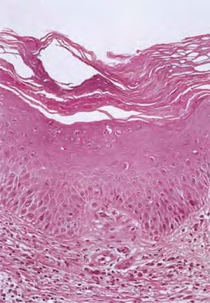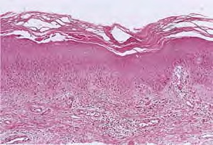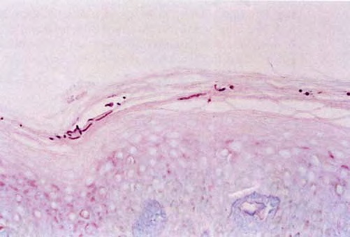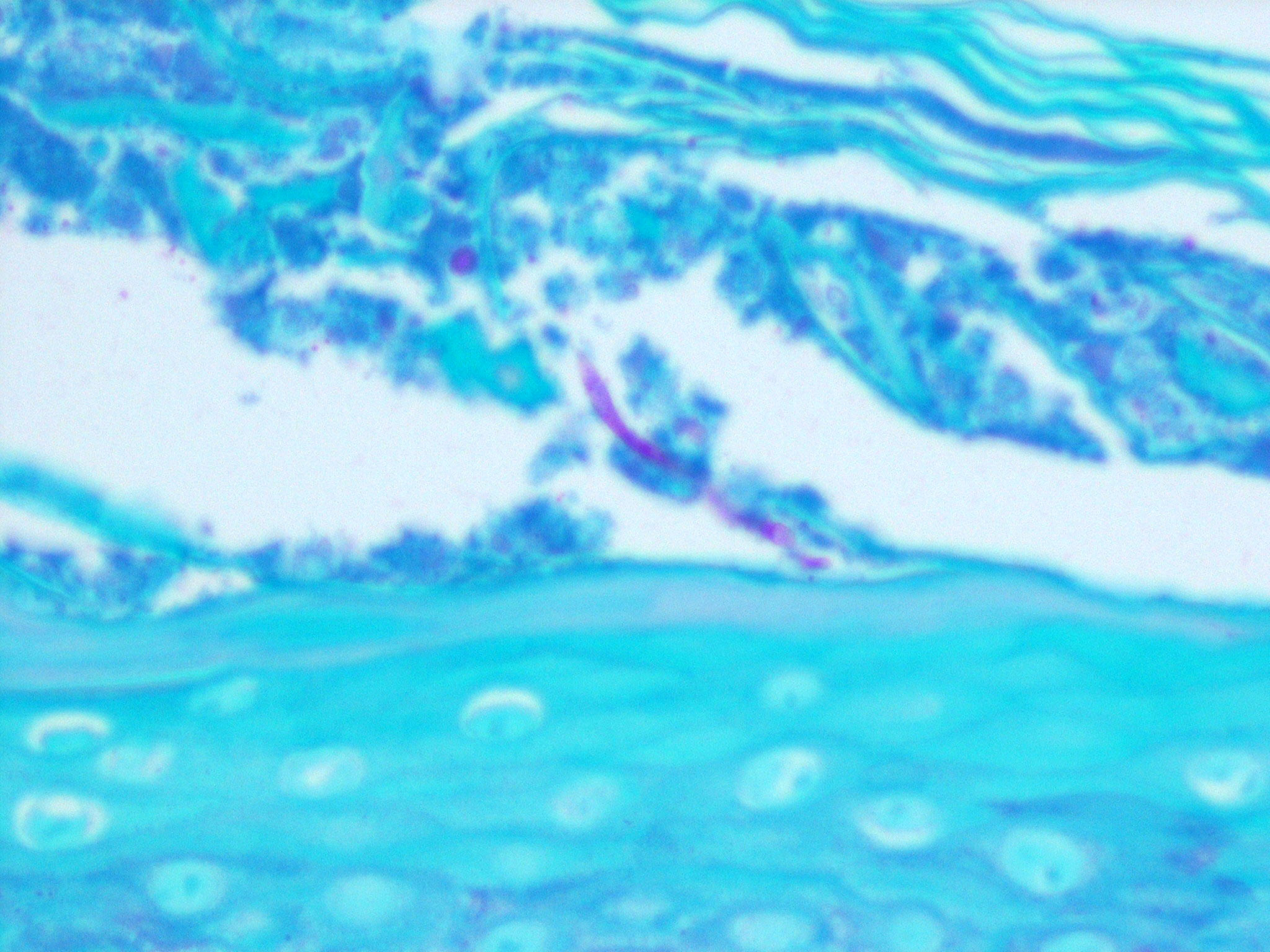 biopsy findings would show spongiosis, parakeratosis (that may alter with orthokeratosis), and a superficial inflammatory infiltrate. Neutrophils may be seen in the stratum corneum, which is a significant diagnostic clue. On occasion, septate branching hyphae are seen in the stratum corneum. Special fungal stains (eg, periodic acid-Schiff, Gomori methenamine silver) may be required.