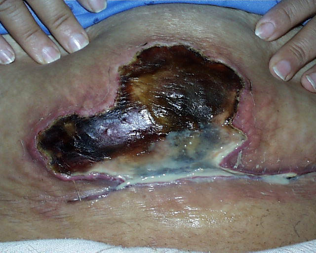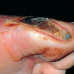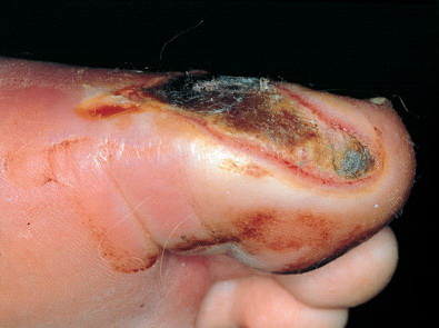 Gangrene is a condition that involves the death and decay of tissue, usually in the extremities. There are three different types of gangrene: dry, wet or gas gangrene. Dry gangrene is the one that most often affects people with diabetes. Reduced blood flow or lack of circulation resulting from diabetes, cardiovascular problems, and smoking are the most common causes. Bacterial infections can also lead to gangrene.