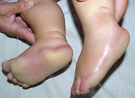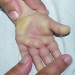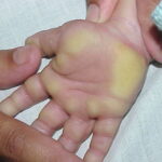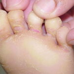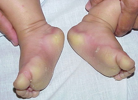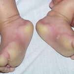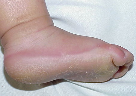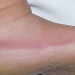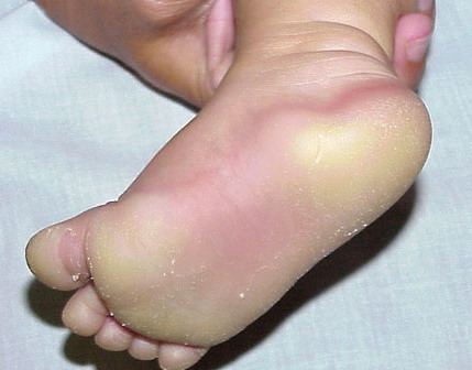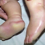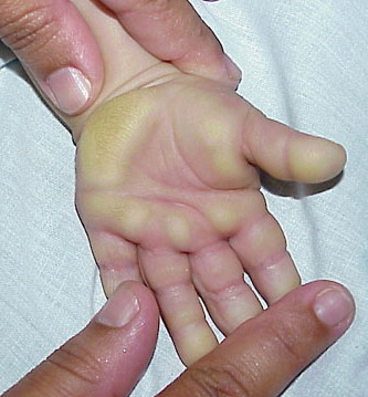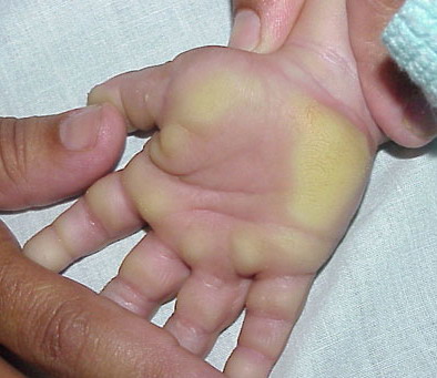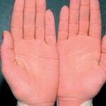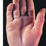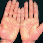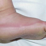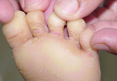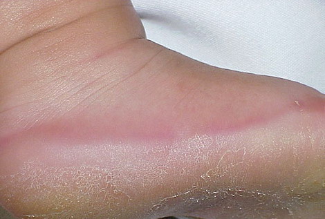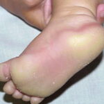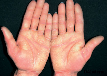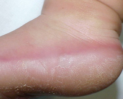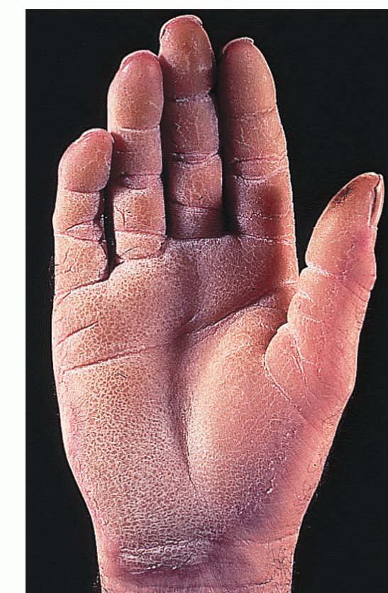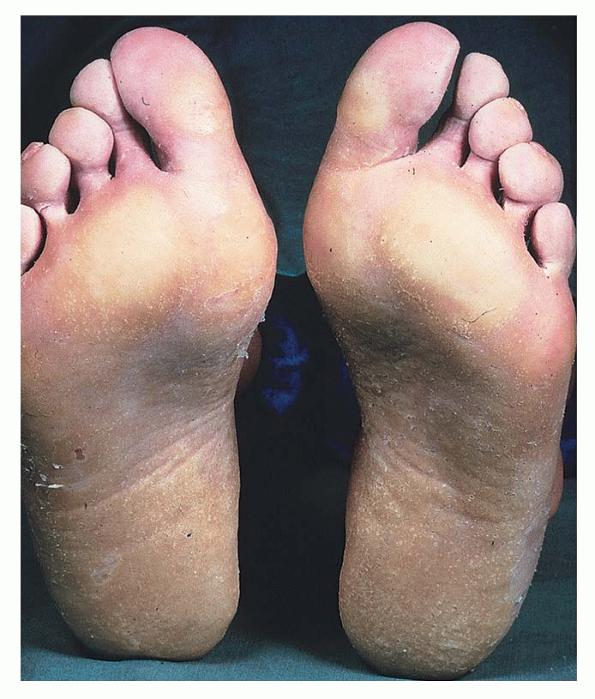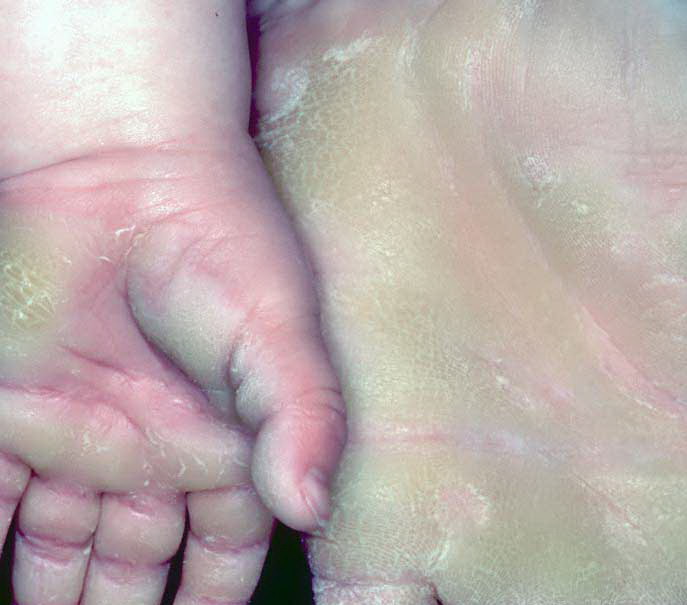 Meleda disease (Mal de Meleda) shows transgressive palmoplantar keratoderma that occurs shortly after birth. This starts with redness on the palms and soles shortly followed by scaling and thickening which then spreads to the dorsal surfaces of the hands and feet and to other body parts, the knees and elbows and other sites of traumatic stress are particularly affected. Hyperhidrosis and perioral erythema are other features associated with Mal de Meleda. This PPK is autosomal recessive and has been identified in a number of consanguineous families, in which linkage analysis has placed the gene at 8qter (31).