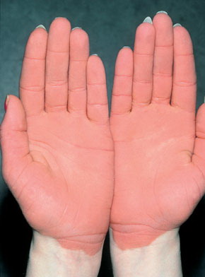Erythrokeratodermia variabilis (EKV) is a phenotypically variable disease and was first described in 1925 (22). It is an autosomal dominant disease, which presents either at birth or within the first year as diffuse thickening of the palmoplantar epidermis with persistent generalized pigmented rough hyperkeratosis (fig. 2c). Patients also suffer from symmetrically distributed fixed hyperkeratotic plaques, which are sharply demarcated and can persist for months or years. Transient erythematous areas occur independently to the hyperkeratosis, lasting from minutes to days, and are usually preceded by a burning sensation (fig. 2d). Both the hyperkeratosis and erythematous patches can be triggered by trauma to the skin, temperature changes, UV exposure, and emotional stress. The lesions affect the whole body but are more often found on the face, buttocks and extensor surfaces of the limbs. Histologically EKV shows no specific features, but there is generalized hyperkeratosis, acanthosis, papillomatosis, dilated capillaries and perivascular infiltration. With increasing age the areas of the body affected by EKV become more restricted to the palmoplantar epidermis.