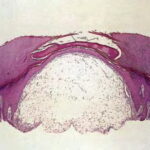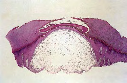 The mechanism of formation of digital mucous cysts is unknown. Currently, it is believed that the cysts arise from mucoid degeneration of connective tissue and that this process, in most cases, involves communication with the adjacent DIP joint and possible coexistence of osteoarthritis. Clinical and radiographic evidence of osteoarthritis is common at the site of the cysts,1 and the frequent presence of osteophytes and spurring of the DIP joint were recognized in the 1970s. Active connection to the joint space may or may not exist, as the mucoblasts associated with the cyst appear capable of sustaining the process.
