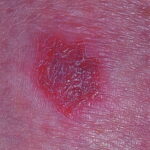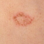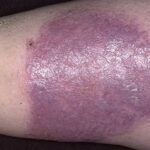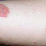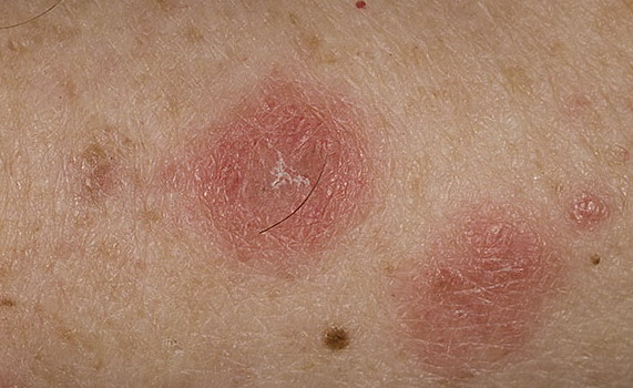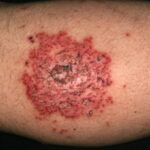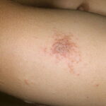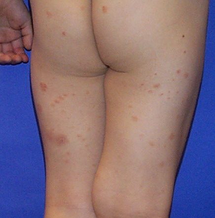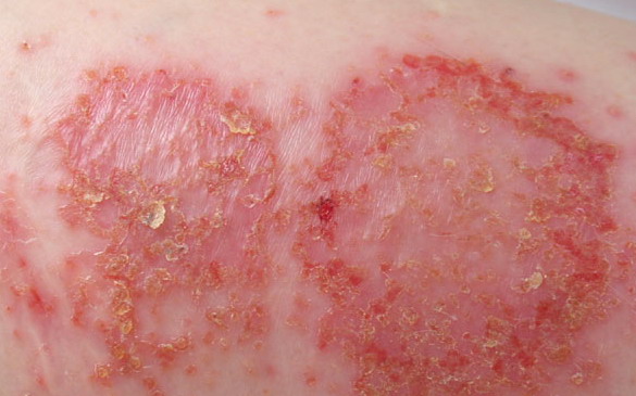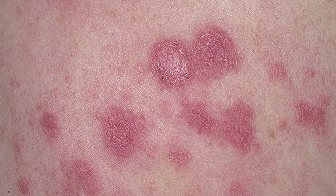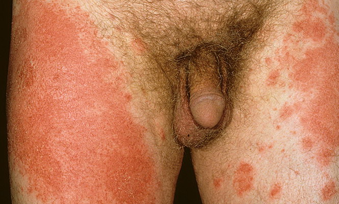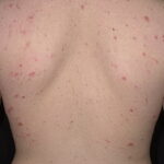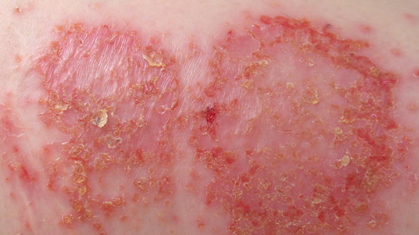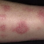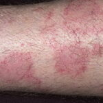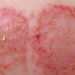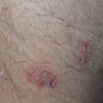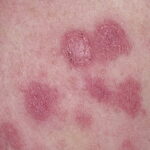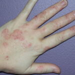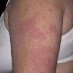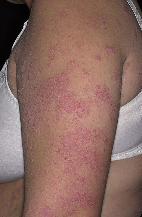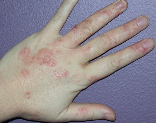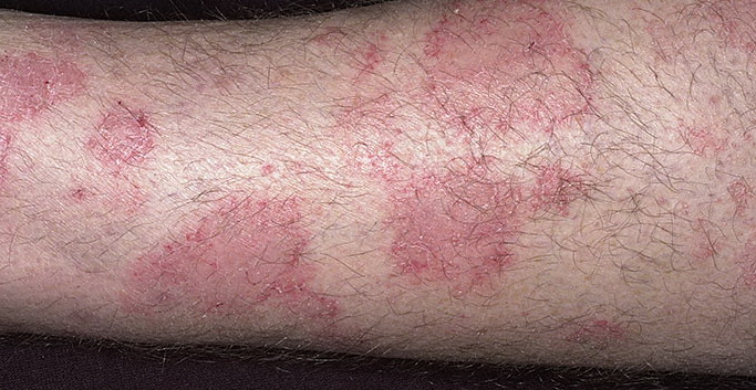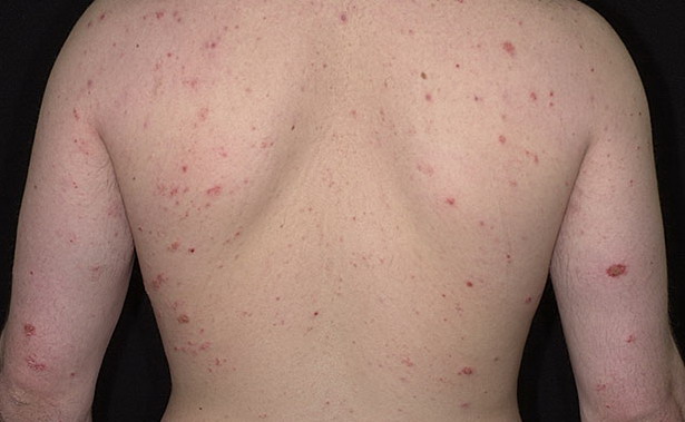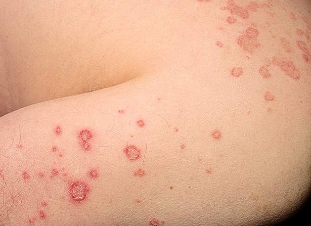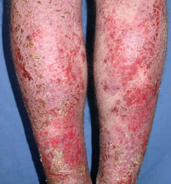 The pathogenesis of nummular eczema is unknown. The vast majority of patients with nummular eczema do not have a personal or family history of atopy, although nummular plaques may be seen in atopic eczema. Numerous factors have been implicated as causal. The state of hydration of the skin in elderly patients has been shown to be decreased. The role of infection previously received much attention in the literature. An internal focus of infection, including teeth, upper respiratory tract, and lower respiratory tract, was found in 68 percent of patients in one study. A role for environmental allergens, such as the house dust mite and Candida albicans has also been touted. Nummular eczema has been reported during therapy with isotretinoin and gold. Generalized nummular eczema is seen in patients with hepatitis C undergoing combination therapy with inter-feron-α 2b and ribavirin. Mercury amalgam was implicated as a cause in two patients.