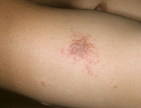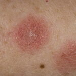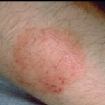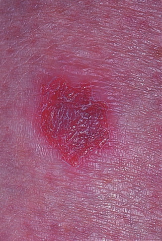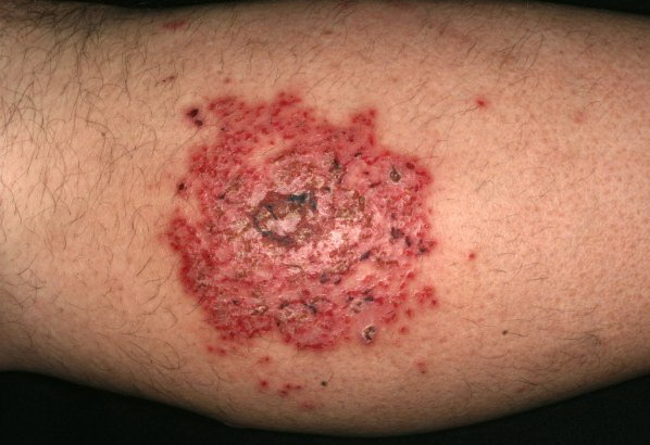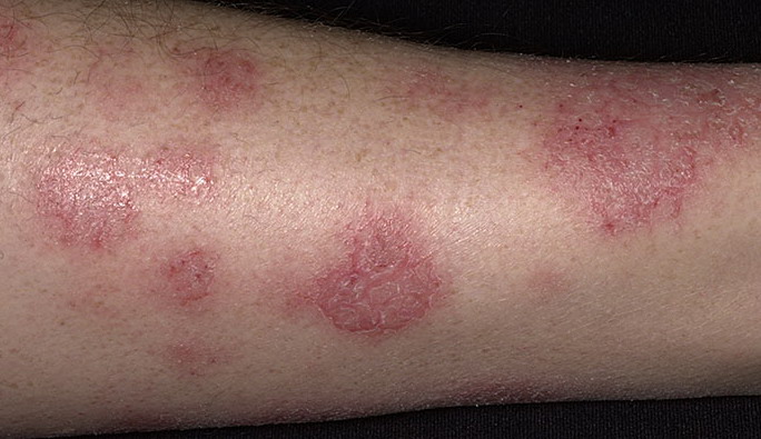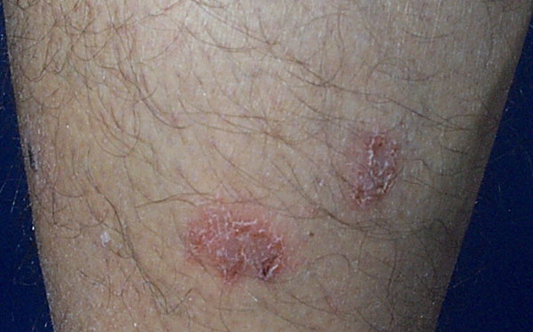Well-demarcated, coin-shaped plaques form from coalescing papules and papulovesicles. Pinpoint oozing and crusting eventuate and are distinctive . Crust may however cover the entire surface . Plaques range from 1 to 3 cm in size. The surrounding skin is generally normal, but may be xerotic. Pruritus varies from minimal to severe. Central resolution may occur, leading to annular forms. Chronic plaques are dry, scaly, and lichenified. The classic distribution of lesions is the extensor aspects of the extremities. In women, the upper extremities, including the dorsal aspects of the hands, are more frequently affected than the lower extremities. Exudative discoid and lichenoid dermatitis of Sulzberger-Garbe may represent a variant of nummular eczema.
