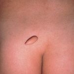 A male child aged 8 years presented to skin OPD for itchy skin lesion over the lumbosacral area. There was history of application of some ‘native’ medicine at the base of ‘tail’ – like lesion over back, which was present since birth. Cutaneous examination revealed a 2 inch long soft pedunculated lesion, surrounding area had few crusted papules and plaques . Other system examination including CNS did not reveal any abnormality clinically. A clinical diagnosis of embryonal tail with contact dermatitis was made. Routine blood and urine examination findings were within normal limit. X-ray of lumbosacral area did not reveal any spinal defect. Surgical excision was done and subjected for histopathological examination. HPE findings revealed normal epidermis with dermis consisting mainly of connective tissue and blood vessels.