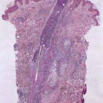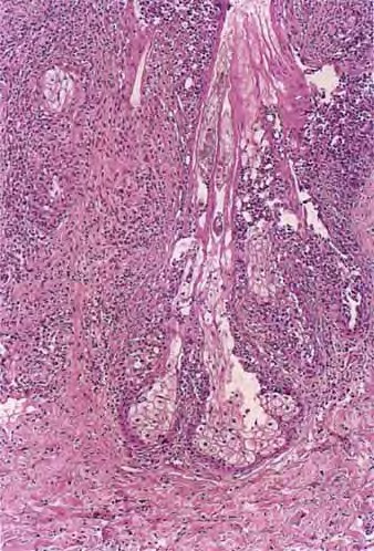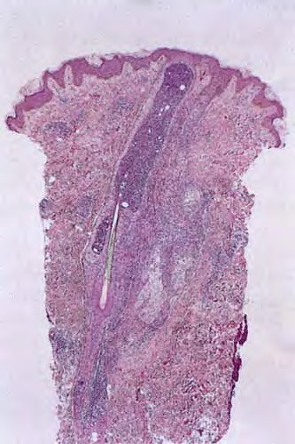 A study of 52 biopsies in 50 HIV-positive patients best described the histology of HIV-associated eosinophilic folliculitis . Perifollicular and intrafollicular lymphocytes and eosinophils are concentrated about the isthmus, and may involve the sebaceous duct. There is spongiosis of the follicular epithelium. Eosinophils and lymphocytes may be seen aggregating in the hair canal, but neutrophils are rare. In early lesions, lymphocytes may predominate and be distributed perifollicularly and interstitially. In more developed lesions, dermal inflammation diminishes and perifollicular/follicular inflammation increases. Less common findings include inflammation of the sebaceous gland, eosinophilic pustules, and follicular rupture (128). Dense eosinophilic infiltrates with degranulation and flame figures, resembling Well’s syndrome, may sometimes be seen. A small number of macrophages can be present. Bacteria, yeast, or Demodex may be identified, albeit away from the areas of inflammation. Because the disorder is highly pruritic, excoriation is a common secondary finding.