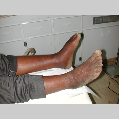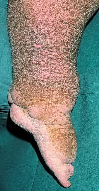 Elephantiasis is characterized by the gross enlargement of a limb or areas of the trunk or head. There is an abnormal accumulation of watery fluid in the tissues (edema) causing severe swelling. The skin usually develops a thickened, pebbly appearance and may become ulcerated and darkened. Fever, chills and a general feeling of ill health (malaise) may be present.