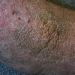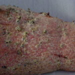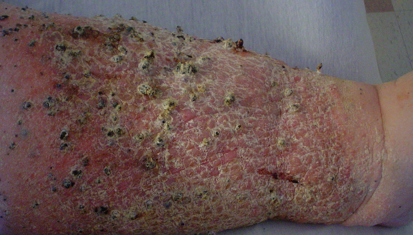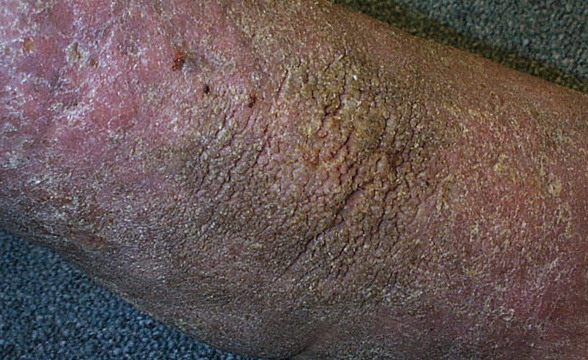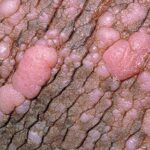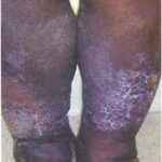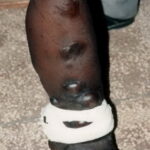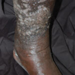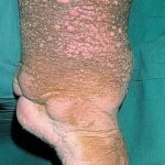 The external parts of the female genital organs (vulva) may also be affected by elephantiasis. A long, tumorous mass covered by thickened and ulcerated skin may develop between the thighs. There may also be an enlargement of the lymph nodes of the legs.